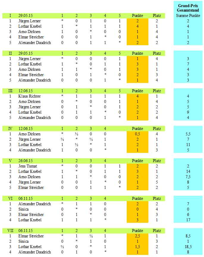 Die Spieltermine werden in loser Folge aber immer zum Spielabend am Freitag angeboten, wobei die Begegnungen vorher abzusprechen sind und damit die Möglichkeit gegeben ist, später ins Turnier einzusteigen und nicht jeden Freitag anwesend sein zu müssen.